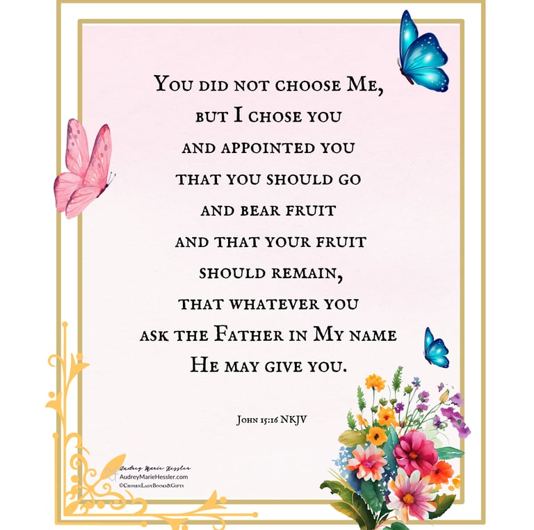 Today... become a woman of generational influence, a woman who influences generations, a beacon of Christ's love and light to people of all ages and races. God's woman is a chosen woman, a woman of faith, grace, and wisdom, and a woman of prayer. And that woman is always learning and growing in Christ. She leads by example and inspires others to follow in her footsteps. Her legacy is one of love, kindness, and service, and her impact is felt for years to come. Together, as women of God, whether young or old, we can inspire and encourage each other to live better lives. Despite past history or current situations, every woman has a God-given purpose and the opportunity every day to grow more Christ-like and become more fully the woman God has called each of us to be, a woman of generational influence, a woman of faith, and grace, a loved and beloved woman with a servant heart who seeks to live life better for the Kingdom of God. Invite me to speak at your next event. Let's touch lives; let's impact generations for Jesus. Chosen Lady, let's share Christ and His truth and let's learn and grow together for God's glory and for such a time as this. Audrey Marie Hessler